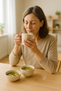 体内の水分が不足すると、便が硬くなり腸内での移動がスムーズに行われなくなります。特に夏場は汗をかくことで知らず知らずに脱水状態になりやすく、冬場は体が冷えることで腸の血流が悪化し、ぜん動運動が低下しがちです。これらを防ぐためには、こまめな水分補給と体を温める工夫が重要です。常温の水や白湯を起床後すぐに1杯飲むことで腸が刺激され、排便反射が起こりやすくなります。また、具だくさんの味噌汁や野菜スープ、ショウガを加えた温かい飲み物なども腸を内側から温め、便秘の予防・改善に役立ちます。特に朝の冷え込みが厳しい季節には、温かいスープを朝食に取り入れることを習慣にすると良いでしょう。